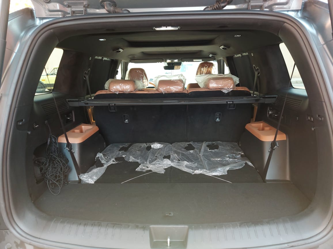 ​الصالون الملكي: 7 كراسي بفرش جلد جملي شيك جداً، مع طبقة نانو سيراميك أصلية مخلياها تلمع زي الألماظ.