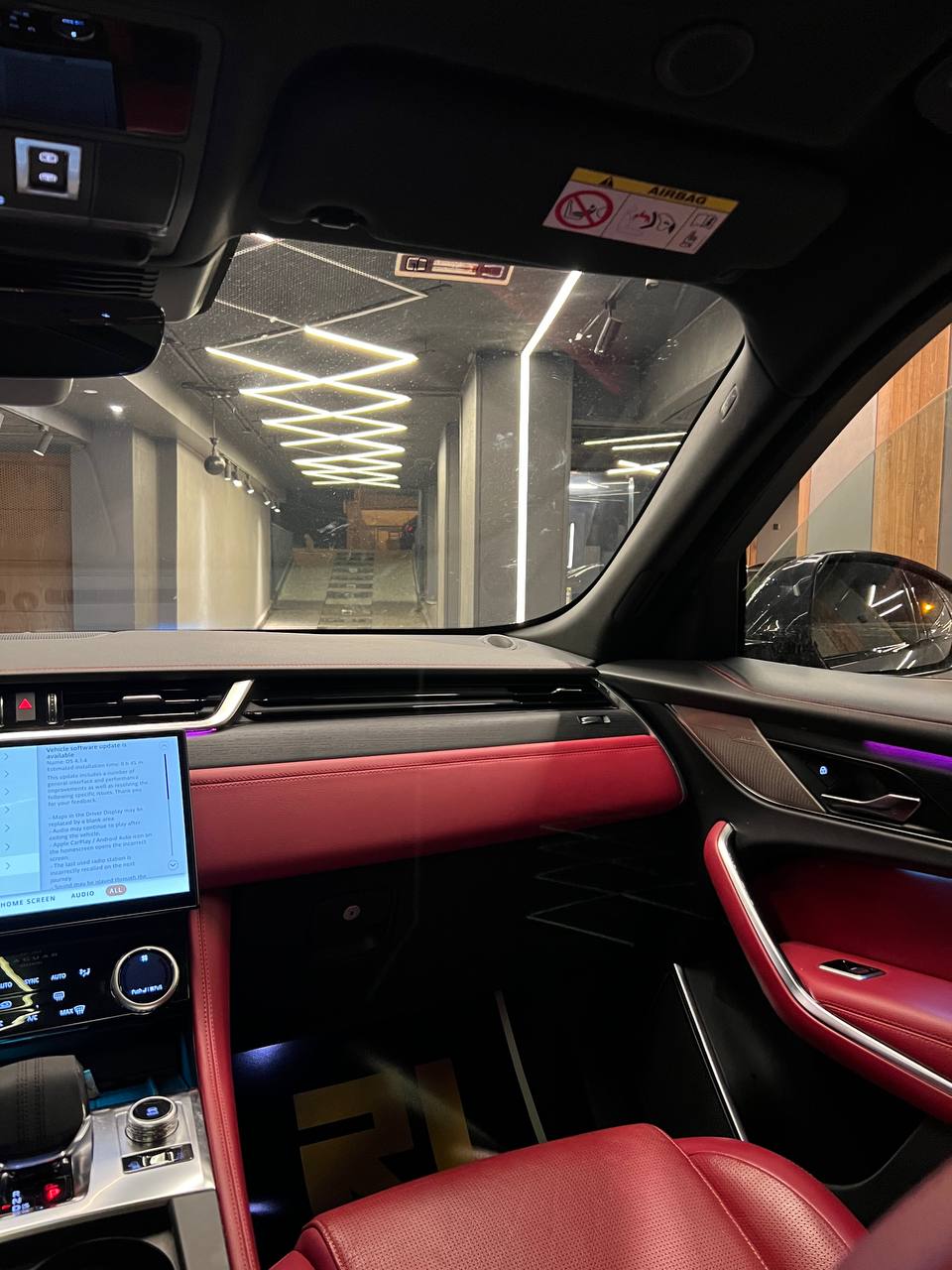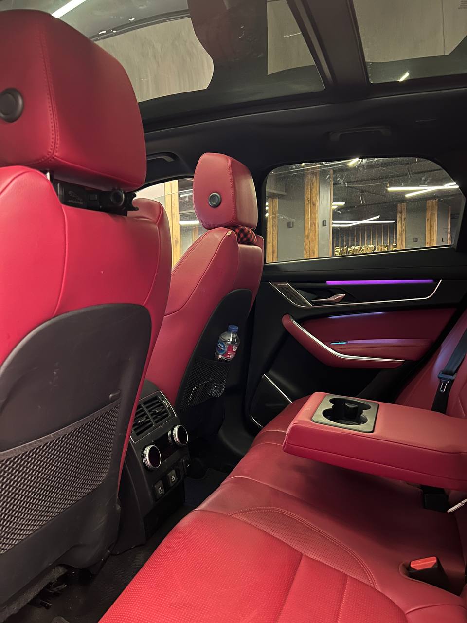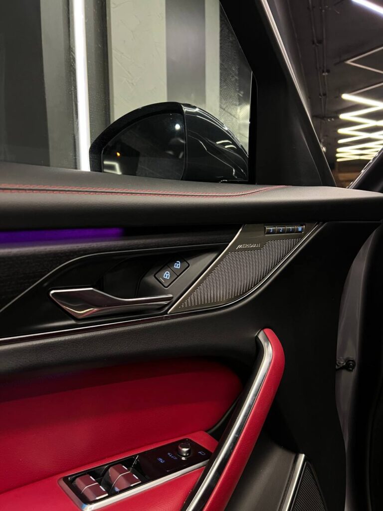 * الصالون الملكي: فرش أحمر (Red) جريء بيعكس شخصيتك، كراسي ميموري، سقف بانوراما، ونظام صوتي Meridian يخليك تعيش جوه المزيكا.
